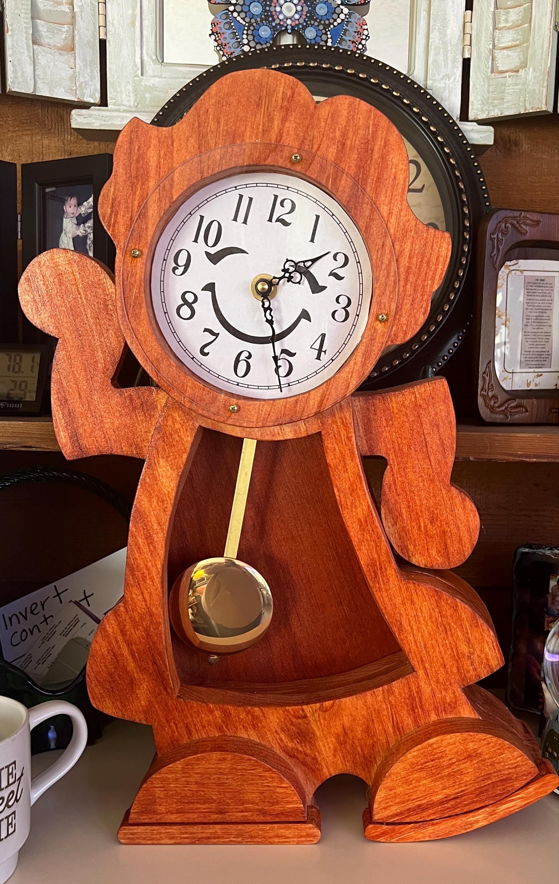 Girl AA battery operated clock with quality quartz movement and working pendulum. Its 18" high and 13" wide and I will stain and clear coat with color of choice just send me a message on what you want